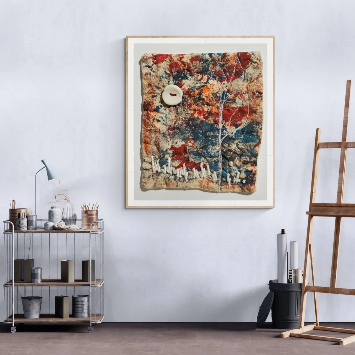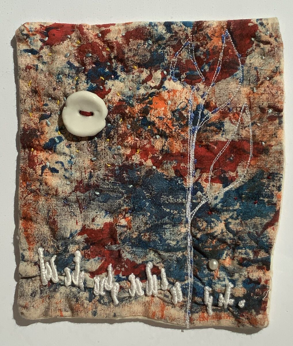 Textile -Mono print onto calico fabric embroidered and embellished and porcelain objects added.